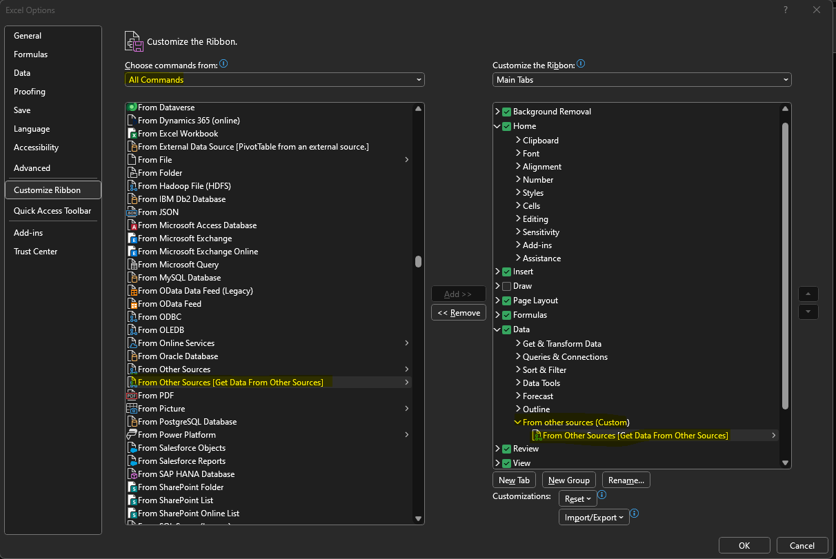 Unless it is hidden somewhere else that we are not seeing when enabling legacy, and it doesn't seem like it from the screenshot some else showed, we don't see that option, but we do see Legacy Wizard show up when legacy is enabled just no From Microsoft Query Option like the above screenshot shows. My users already gone for the week, or I'd jump in and grab a couple more screenshots, I can supply next week if needed.