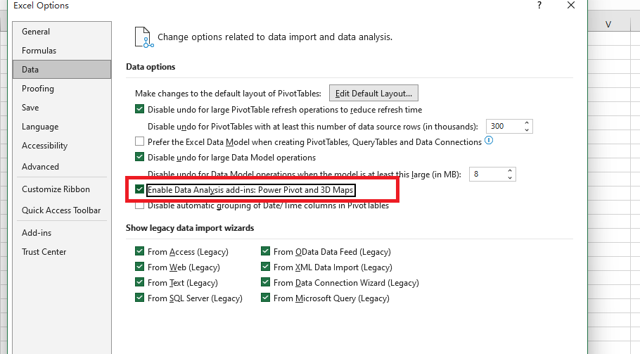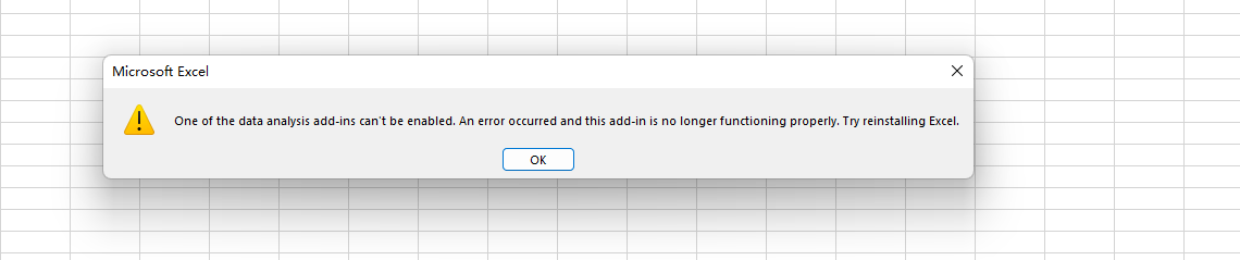 I'm dealing with a very strange problem right now. Whenever I tried to import data into my workbook either from text or web and so on, it didn't work at all. Sometimes there would be a warning window jumping out saying that '' Excel should be reinstalled or repaired" as image 0 below showed, and sometimes " Power Query wasn't able to start and Excel should be restarted" (image 1). So far I have not only completely reinstalled my Office tools many times, but also restarted Excel over and over, at the same time I also tried to open Excel in a safe mode, BUT it still didn't work, I mean importing data is still impossible. I've also tried to solve it by setting Excel Option - Data, but I found that whenever I tried to check the option of "Enable Data-Analysis add-ins Power Pivot"(image 3), it warned me again saying add-ins can't be enabled(image 4).