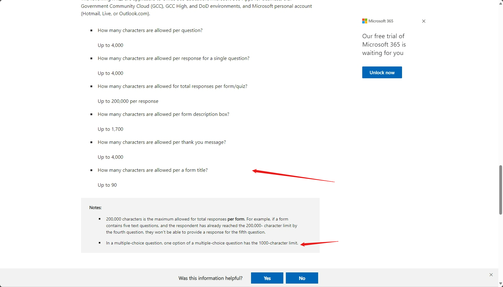 Welcome to the Microsoft Community! I realize that you've encountered a problem with character limit when using Microsoft Forms and I understand how you feel. In fact, Microsoft Forms has different restrictions on form controls. For example, a multiple choice question is limited to 1,000 characters per option, for a single question, a maximum of 4,000 characters per response is allowed, and so on.