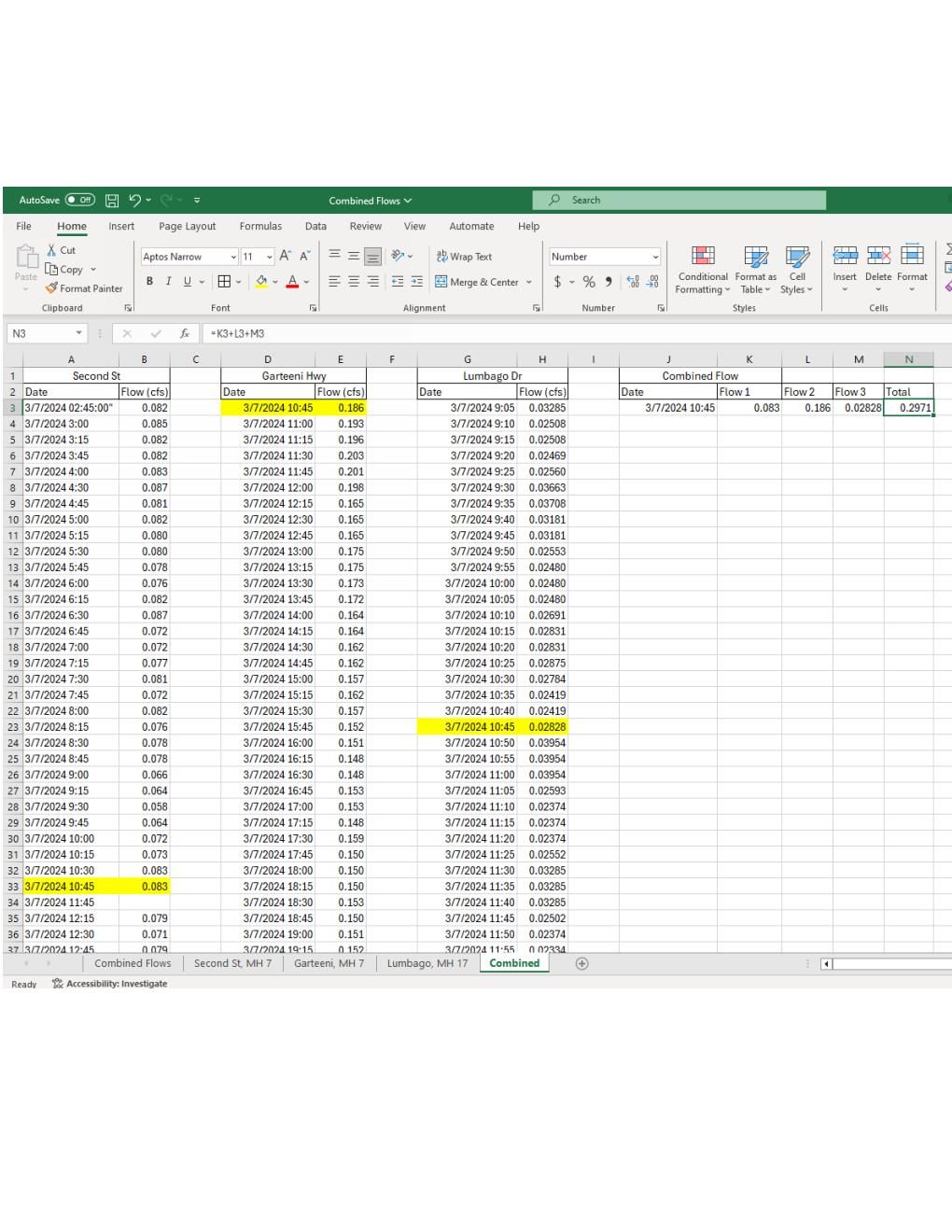 Hello there, first time asking a question so be gentle. I have data from three different meters, each meter gives a timestamp in one column and the data in a second column, so six columns total in excel. However one meter records data every 5 minutes, vs 15 minutes for the other meters. I need to make a plot with the meter data combined. How can I sort the data so the dates and data values match up in a row? I dont know how I can upload the file but I can maybe do a screenshot. The data in columns J and K is an example of what I am trying to achieve if that helps. There's far more data from the Lumbago meter than the other two meters also. So basically I want the data from each meter on day X, time Y to match up so they can be easily added together.