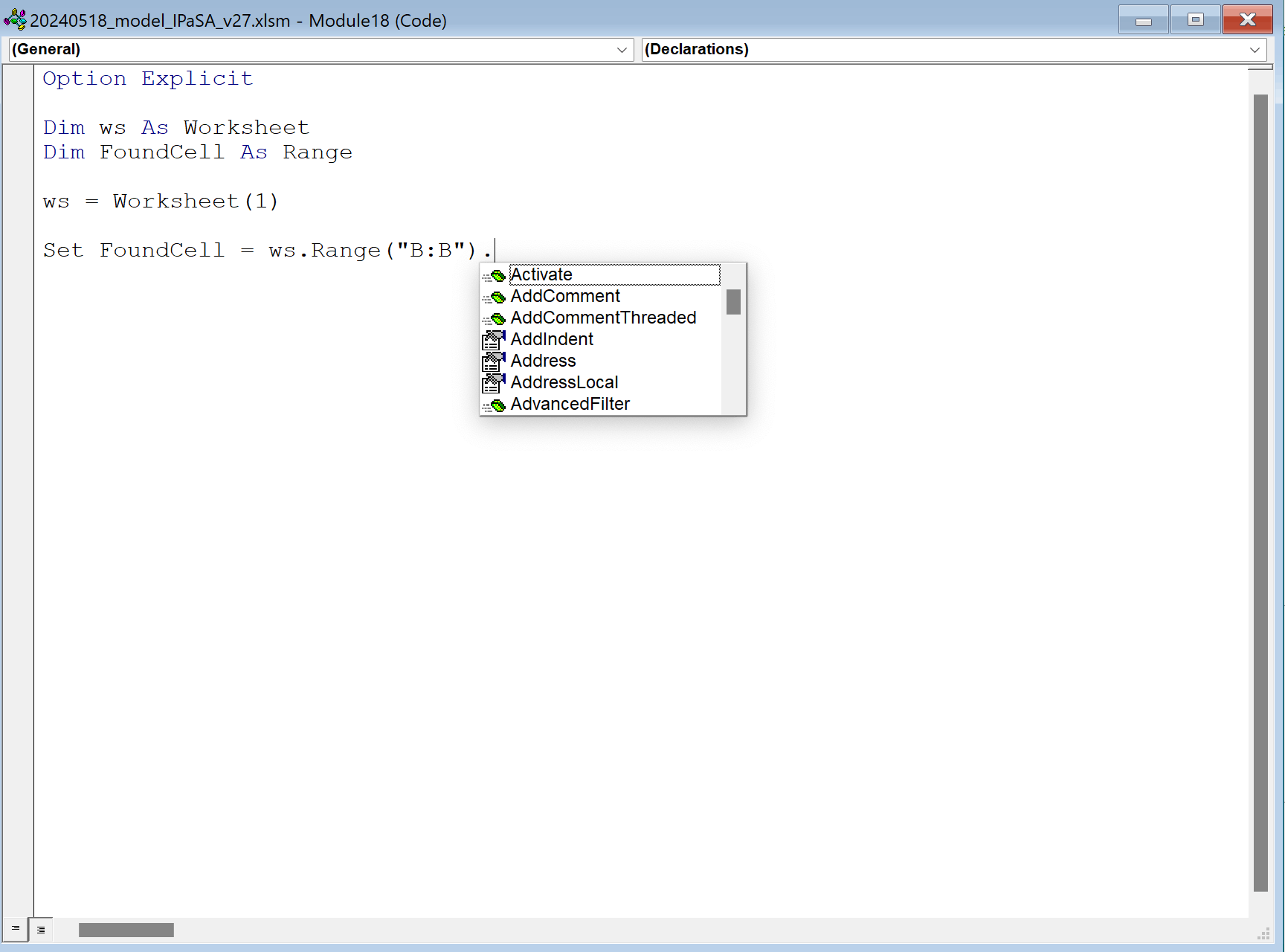 I then -- as the final test -- went on to type " Set FoundCell = ws.Columns("B").Find(" and again InetlliSense is not working (i.e., the list of methods did not appear, pressing CTRL + J resulted in a beeping sound, and pressing CTRL + Spacebar resulted in beeping sound).