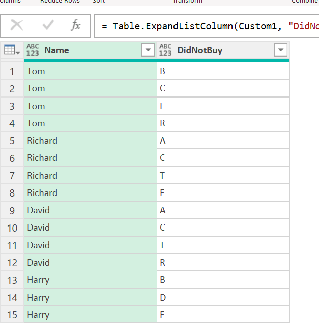 so bringing in product table as list and subtracted items bought , this can then be expanded and pivoted.