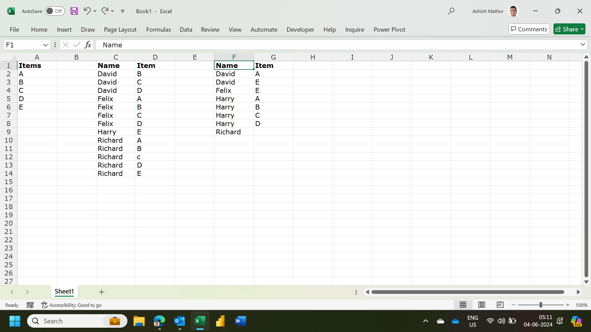 in excel have got as far as this Items = All items, the right table has been sorted, but his is just for clarity,