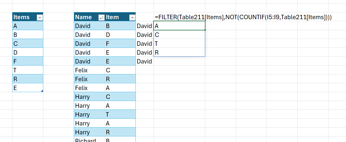 Using just Excel formulas. ChangeTable1 to the name of the first table (the one with the Items column) and Table2 to the name of the second table (the one with the Name and Item columns).