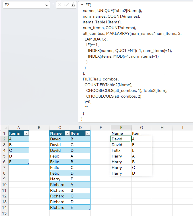 CHOOSECOLS(all_combos, 1), Table2[Item],