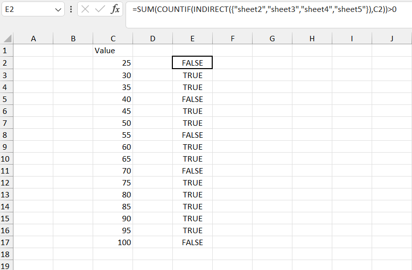 =SUM(COUNTIF(INDIRECT({"sheet2","sheet3","sheet4","sheet5"}),C2))>0