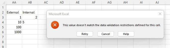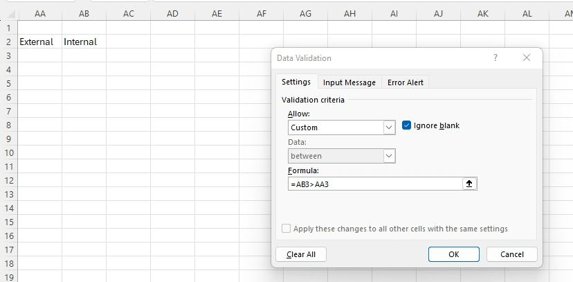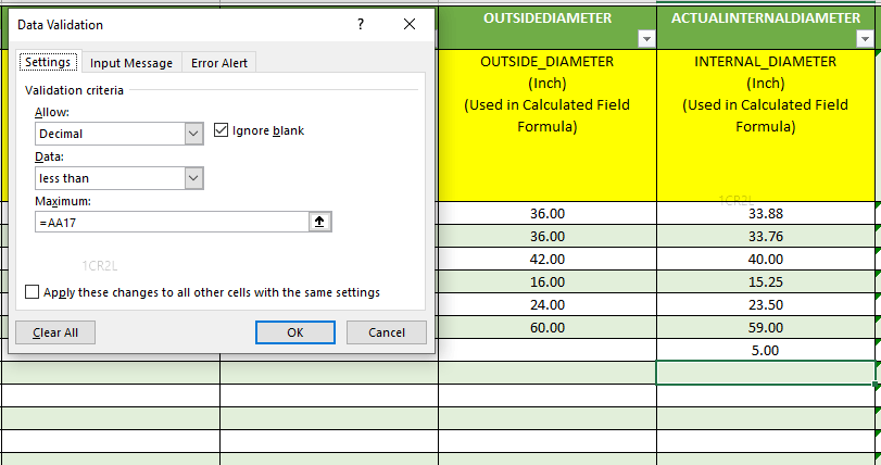 I have a very large Excel Sheet to gather Data and use to calculate other fields based on some of the sheet fields. I need to make sure that with some data validations guide users to enter logical data. For example there are 2 fields [OutsideDiameter] and [InsideDiameter]. I need to ensure that values entered for [InsideDiameter] field is not >= [OutsideDiameter].