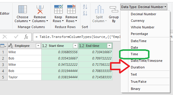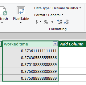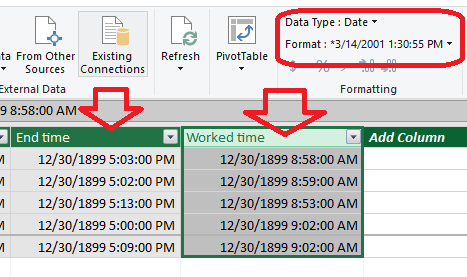 In Power Pivot (AFAIK) you can not change the data type to Duration, but it is there. How do we get it... later.