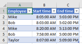 I have an Excel sheet with two tables (that are indeed tables), one with a single-column with employee names, and the other which is an array with the start and end time of each employee and the corresponding worked time that is automatically computed; this second table has various entries for each employee.
