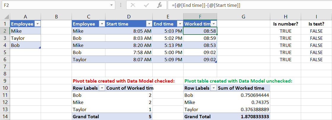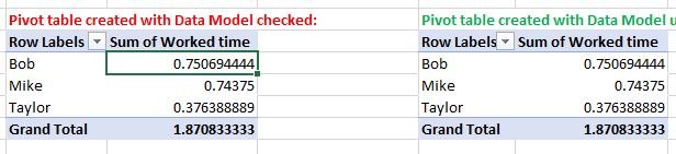But if I create the Pivot Table with the "Add this data to the Data Model" checkbox unchecked, then there's no error. I've checked that the value of the cells in the worked time of each employee is indeed a number, and not a text.