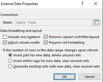 I've noticed that manually modifying the external data properties in the table after refresh seems to work as a workaround. However, is there a way to configure Power Query to automatically update the table without requiring this manual step? This issue is affecting all my colleagues, and the resulting data suffers from this delay.