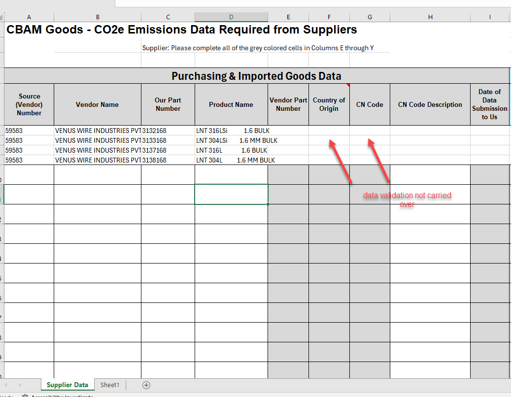 Before running this macro, ensure that you have a worksheet named "Sheet1" containing your data and another named "Template" set up as you desire for the output format. This macro creates new workbooks based on the unique supplier numbers, naming them accordingly (e.g., "Supplier_123456.xlsx"), and saves each workbook in the same directory as your original workbook.