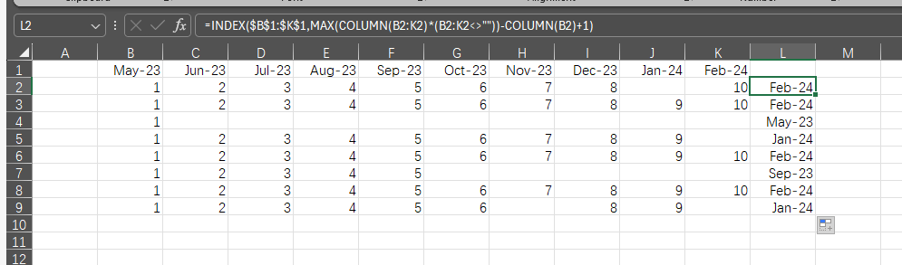 =INDEX($B$1:$K$1,MAX(COLUMN(B2:K2)*(B2:K2<>""))-COLUMN(B2)+1)