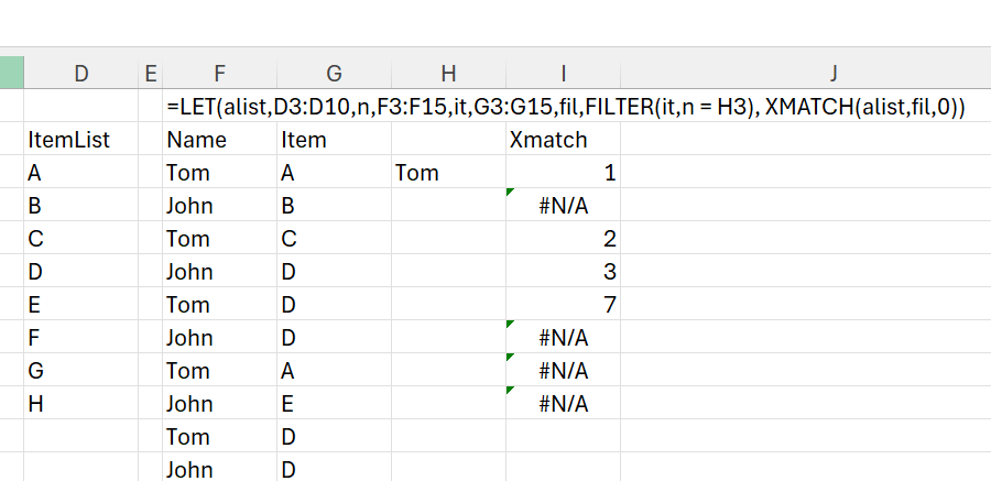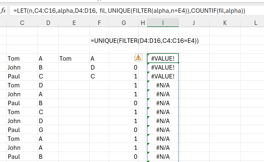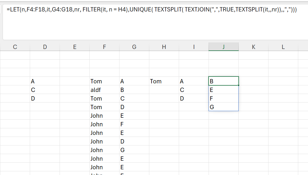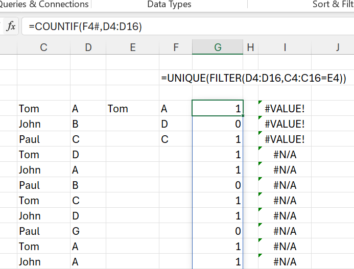 =UNIQUE(FILTER(G4:G14,ISERROR(XMATCH(G4:G14,I4:I6))))