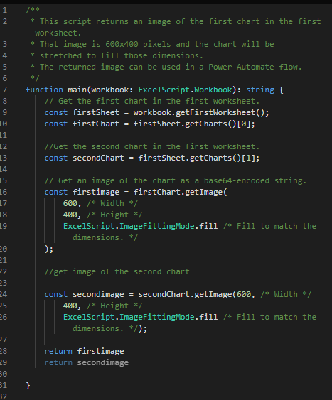 function main(workbook: ExcelScript.Workbook) { let charts = []; let sheet = workbook.getWorksheet("Sheet1"); let chart1 = sheet.getCharts()[0]; // Assuming the first chart is located on the first sheet let chart2 = sheet.getCharts()[1]; // Assuming the second chart is located on the first sheet