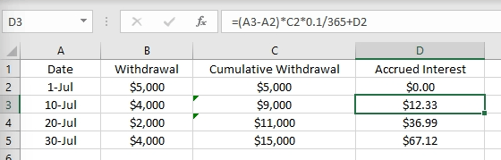 - Data Layout: Organize your data into four columns: Date, Withdrawal, Cumulative Withdrawal, and Accumulated Interest.