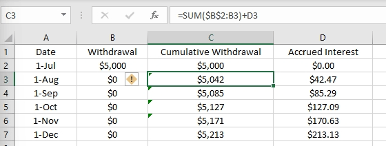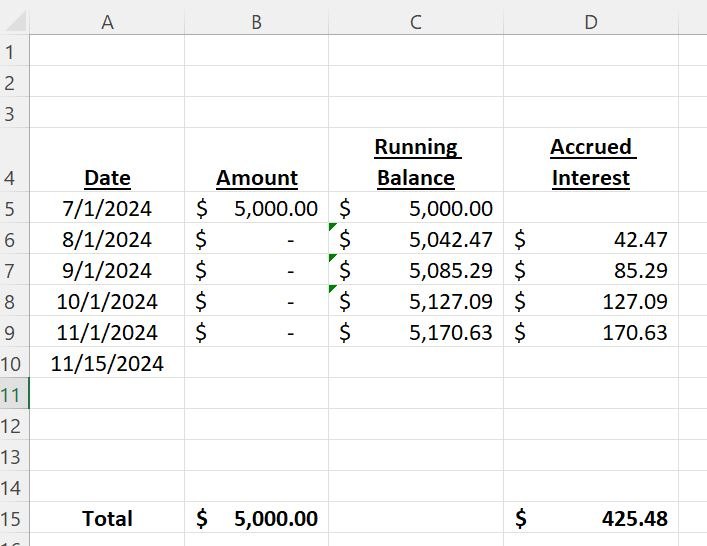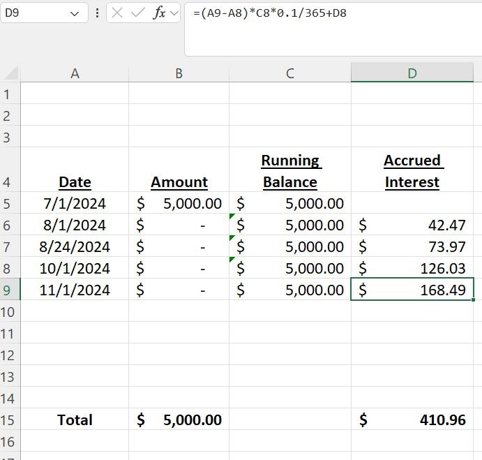 =SUM($B$2:B2), and for B3,=SUM($B$2:B3), continuing this pattern down the column. - Interest Accrual: The interest calculated is compounded daily up to the current date. For instance, the accumulated interest up to July 10th would be calculated in cell D3 with a formula like