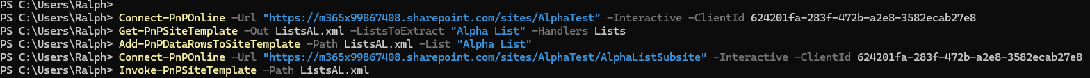 We’ll use the Add-PnPDataRowToSiteTemplate cmdlet to populate our list instances with actual list item. Add-PnPDataRowsToSiteTemplate -Path ListsAL.xml -List "Alpha List" Now we connect to the target site. Connect-PnPOnline -Url "https://m8.sharepoint.com/sites/Beta" -Interactive -ClientId 6227e8 And we apply our template using the Invoke-PnPSiteTemplate cmdlet.