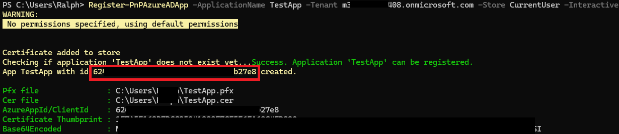 Register-PnPAzureADApp -ApplicationName TestApp -Tenant m*************8.onmicrosoft.com -Store CurrentUser -Interactive