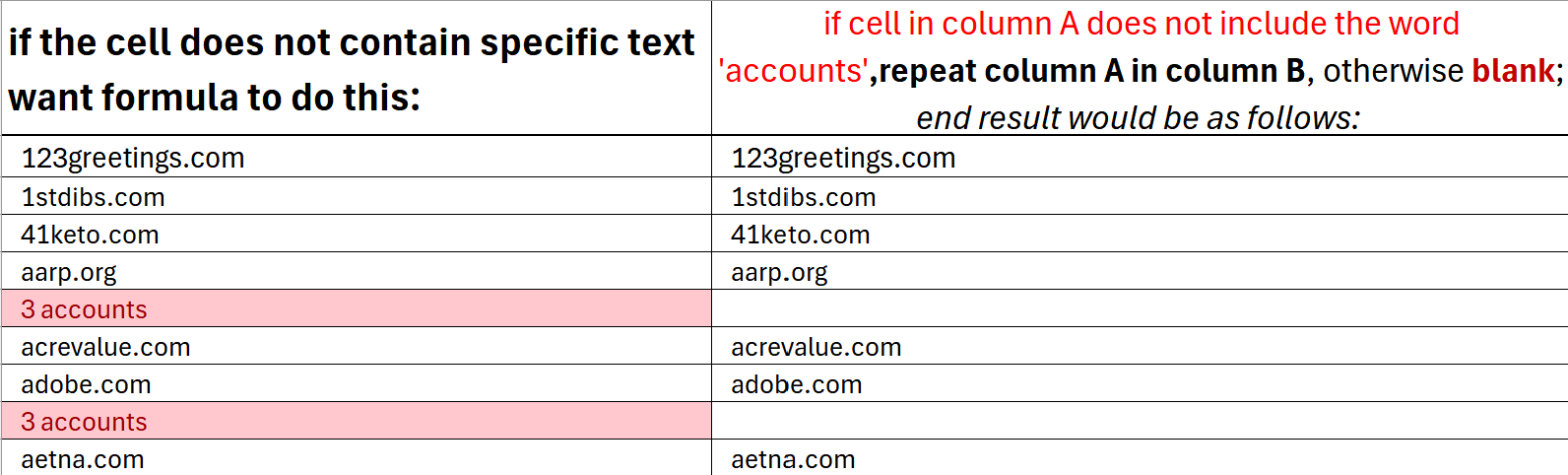 This formula checks if the word ‘accounts’ is present in each cell of column A. If it is, it leaves the corresponding cell in column B blank. If not, it repeats the content from column A into column B.