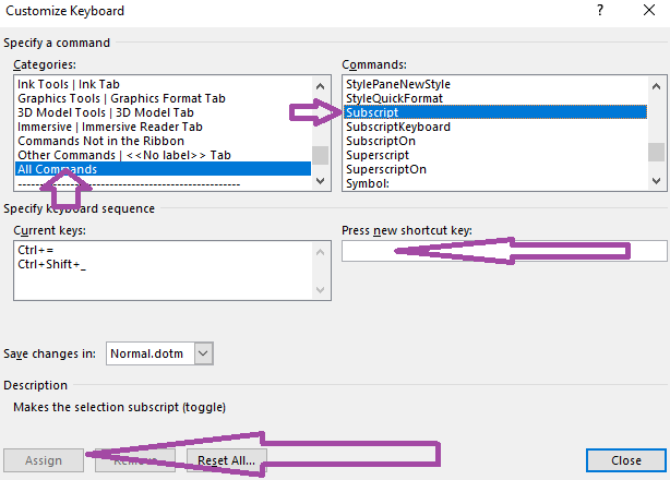 You can set your preferred shortcut via the Customize Keyboard dialog box. Click File > Options > Customize Ribbon > Customize to display the dialog box. Choose the "All Commands" category and find the Subscript command. Click in the "press new shortcut key" box and enter your preferred shortcut. Make sure that "Save changes in" is set to "Normal" and click the Assign button.