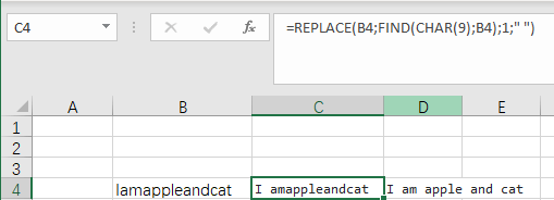 - Use the SUBSTITUED function. =SUBSTITUTE(B4;CHAR(9);" ")