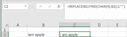 =REPLACE(B2;FIND(CHAR(9);B2);1;" ")