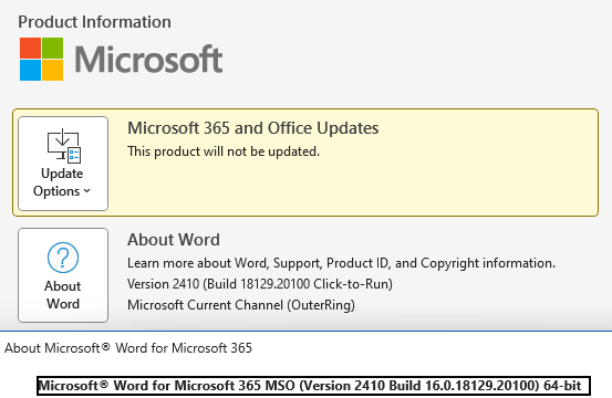- May I confirm the version number of the Word (File > Account > About Word) you are using with? Please provide me a screenshot of your Word version in the following format: