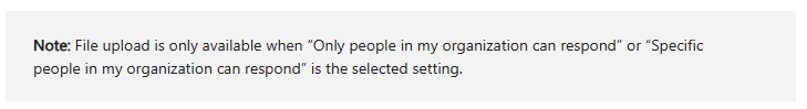 If yes, "Upload File" option is not available. You may switch to “Only people in my organization can respond” or “Specific people in my organization can respond” and then check if you can use "Upload File" option.