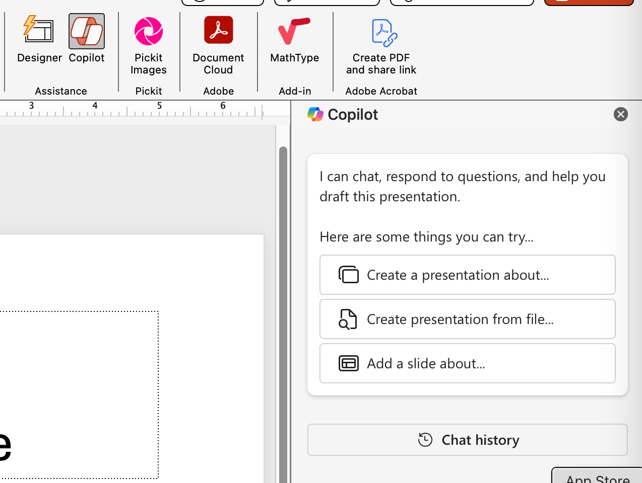 In powerpoint (on my MacBook), there is no prompt nor ability to create a presentation from file, like it shows in many online tutorials for Copilot.