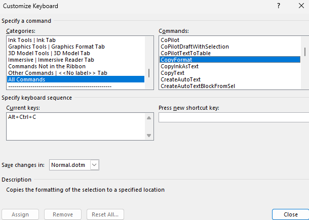 • Use the same steps to assign the Ctrl+Shift+V shortcut to the PasteFormat command. When you press the shortcut but before you click the Assign button, the "Currently assigned to:" line says "PasteTextOnly", and clicking Assign now removes that shortcut from the PasteTextOnly command and adds it to PasteFormat instead.