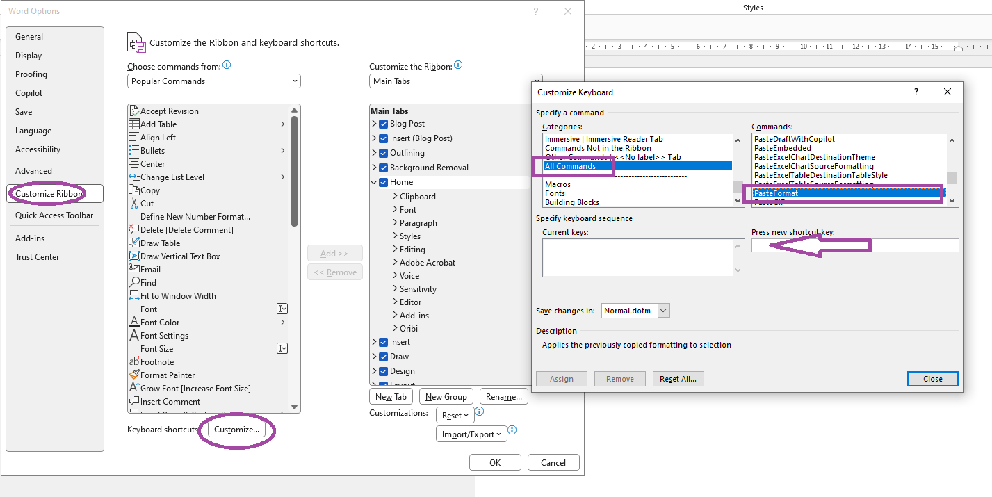 - Use the same steps to assign the Ctrl+Shift+V shortcut to the PasteFormat command. When you press the shortcut but before you click the Assign button, the "Currently assigned to:" line says "PasteTextOnly", and clicking Assign now removes that shortcut from the PasteTextOnly command and adds it to PasteFormat instead.