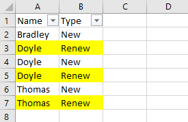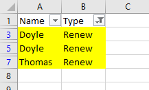 For example, if I want to filter cells where Type=Renew, theoretically, the yellow cells represent the data filtered out after Type=Renew.
