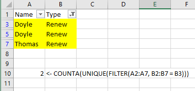 =COUNTA(UNIQUE(FILTER(A2:A7, B2:B7 = B3)))