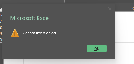 I am having trouble inserting .docx as an object into my Excel sheet. I got this error message here that says "Cannot Insert Object". I can insert .pdf , but not .docx.