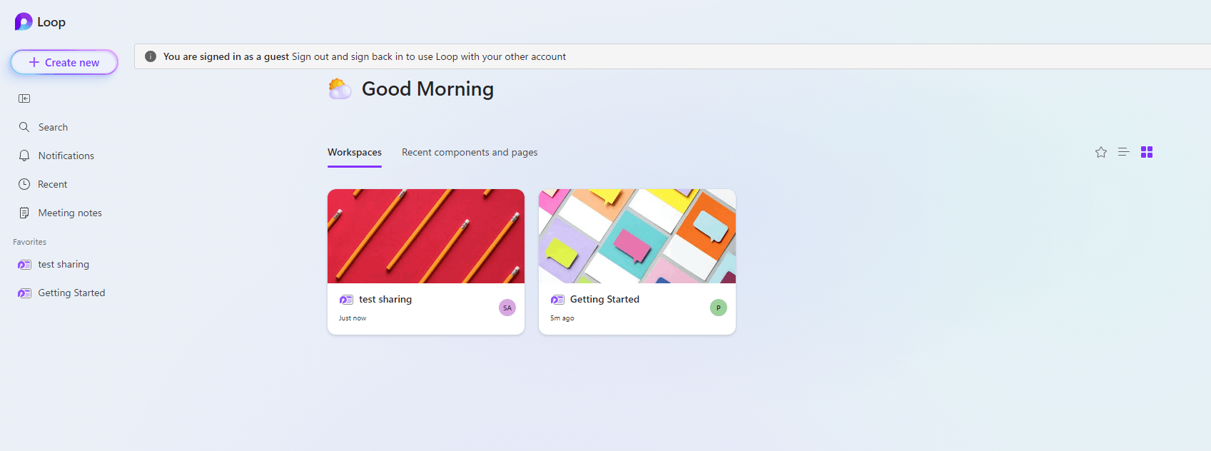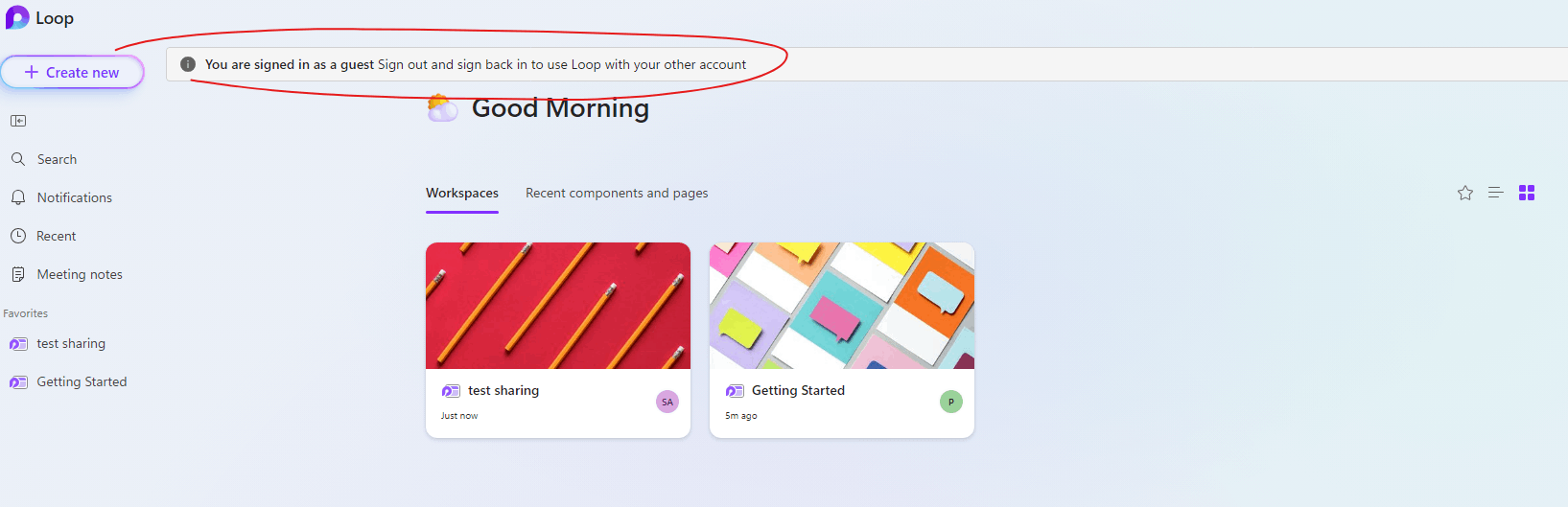 However, we cannot access the shared Loop workspace in Loop mobile app or Loop web app when we're signed in with the account that are not signed in as a guest as shown below: