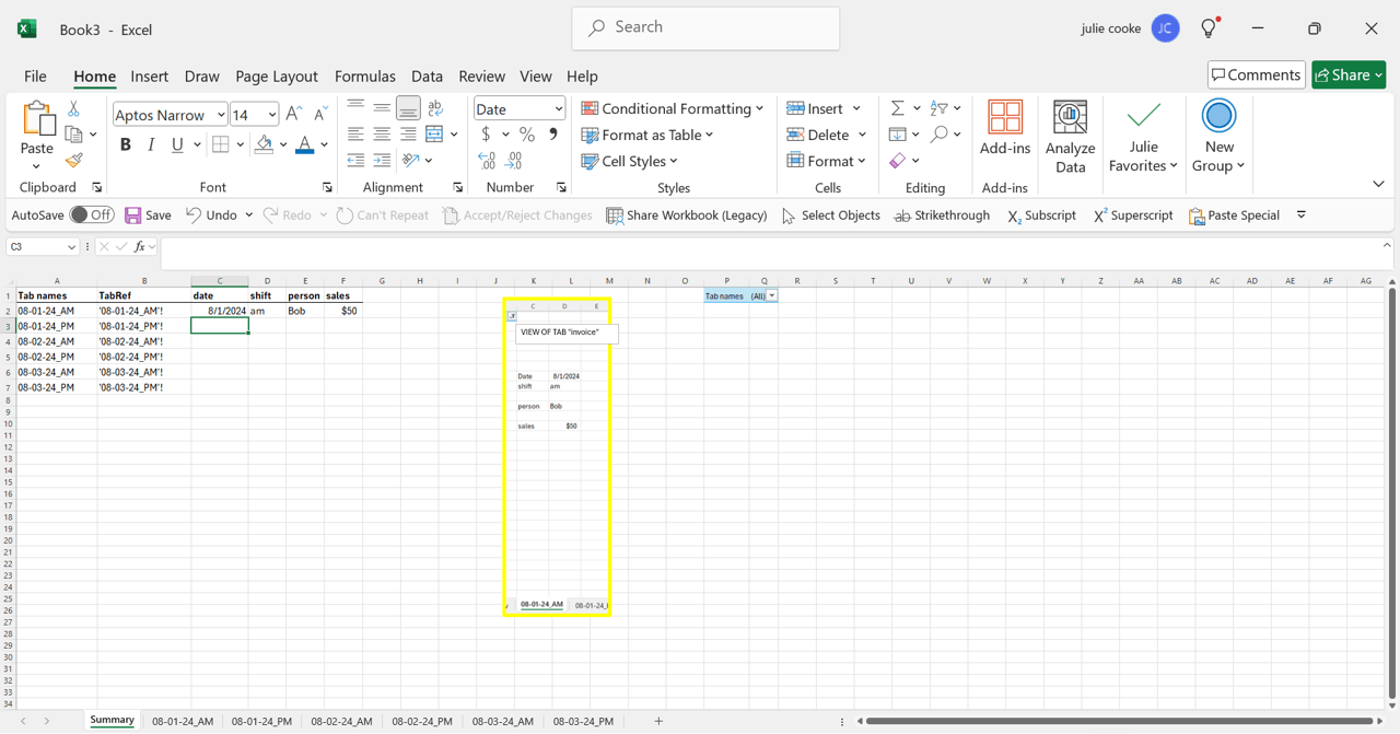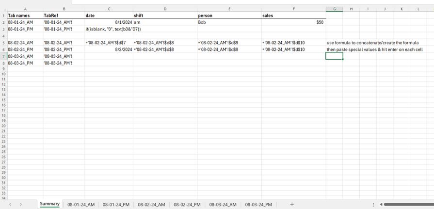 I'm trying to pull data from various tabs in a worksheet. (like each sheet is an invoice (yellow sample) & I want to create a summary page). I'm trying to create the formula to reference a list of the tabs, but can't get the syntax right. I can get it to work by concatenating the parts of the formula, then activating each cell (erase the =, retype it, then hit enter) - but that's too much work for hundreds of instances. It seems like it should be easy & lots of help doing the reverse (making invoices from a dataset), but I can't quite get it - what am I missing? Also, trying to avoid VBA/code to keep it simple for other users.