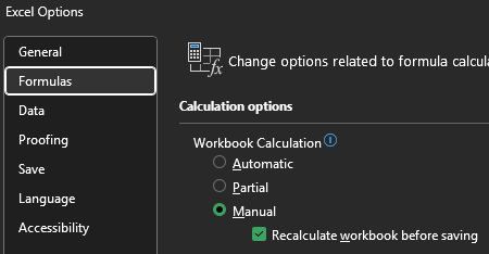 Even if I miraculously manage to have a file set on Automatic (by copying all the sheets to a new file that I managed to put on Automatic), as soon as I start working on the sheets, it reverts back to Manual in the Excel Options.