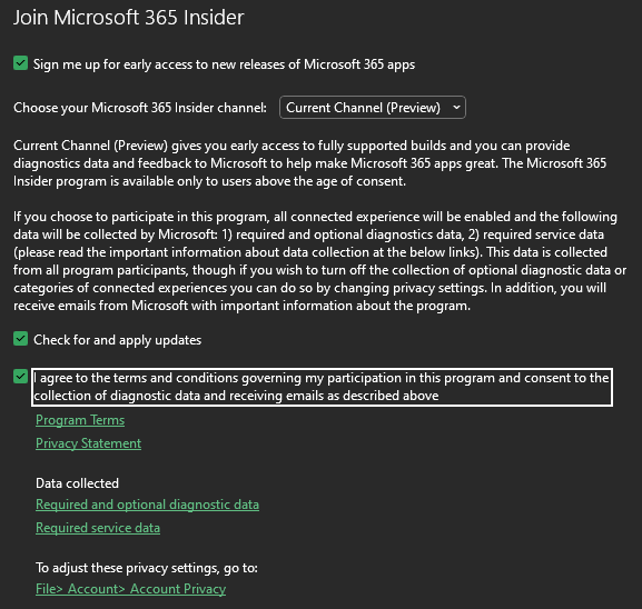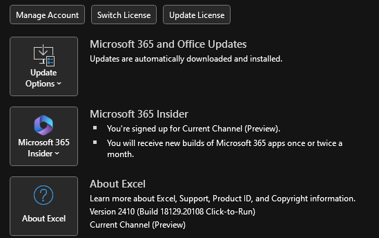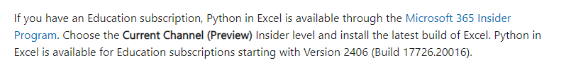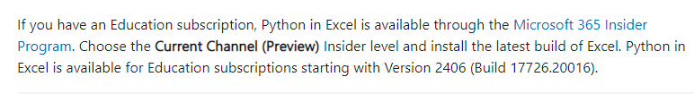 If you have an Education subscription, Python in Excel is available through the Microsoft 365 Insider Program. Choose the Current Channel (Preview) Insider level and install the latest build of Excel. Python in Excel is available for Education subscriptions starting with Version 2406 (Build 17726.20016).