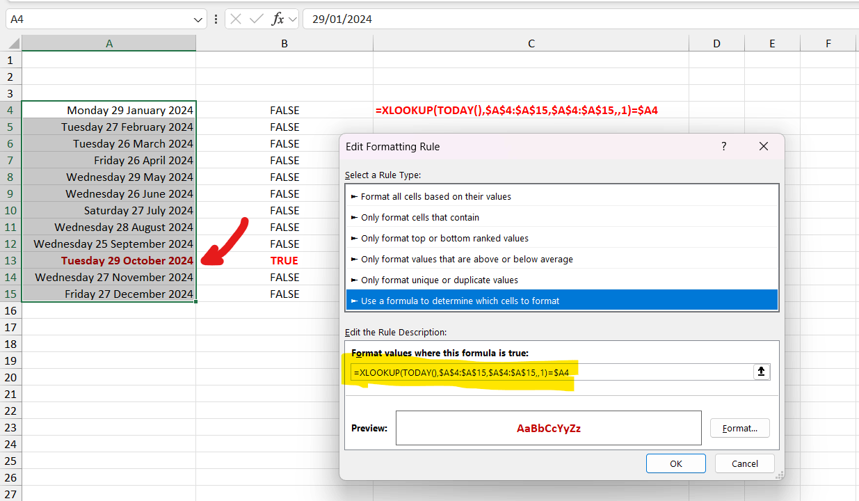 =MONTH(A4)=MONTH(TODAY())+1 didn't work. A4:A15 are the paid dates above. In C2 I have the formula: =XLOOKUP(TODAY(), List! A4:A15, List! A4:A15, "", 1) Which is the date that I am looking for. (Which is Tuesday 29 October 2024). Currently I am using the formula: =MONTH(A4)=MONTH(TODAY()) which works up until Wednesday September 25 2024, but then keeps being highlighted until the 01 October 2024. After Wednesday September 25 2024 I would like Tuesday 29 October 2024 Highlighted.