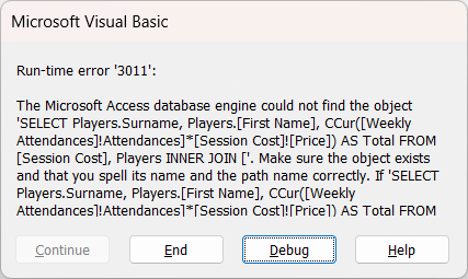 active_sql = "SELECT (Players ... ... ON Players.EBU_number = [Weekly Attendances].EBU_number) {WHERE} ORDER BY Players.Surname"