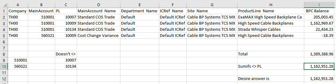 Any suggestion on how to fix the formula, to get to sumifs correctly get the total correct. In the data set there are many more PL's, and I am trying to make the formula as simple as possible.