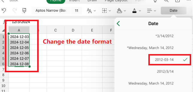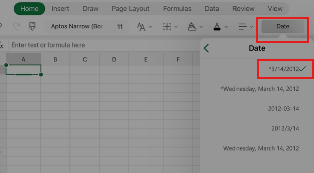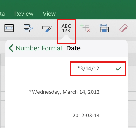 In Excel, in "Home"-Format-Select "Date" to confirm (some pages may be directly displayed as General or Format, and some pages in iPad are icons with the letter "a")