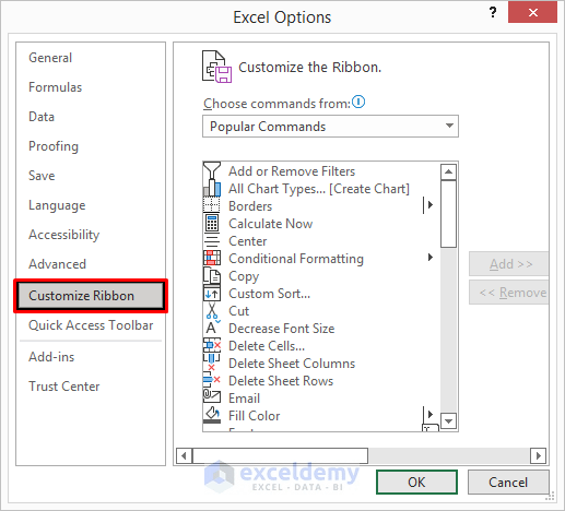 Open Excel and click the File tab-Options-Customize Ribbon.