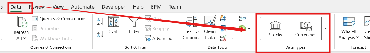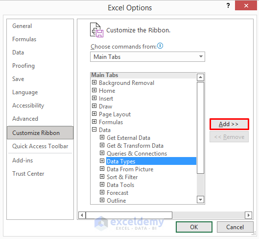 Click OK to close the Excel Options window. Navigate to the Data tab and verify that the data type is present.