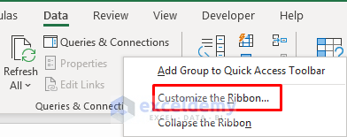 Or, right-click a blank area in the ribbon and select Customize Ribbon from the context menu.