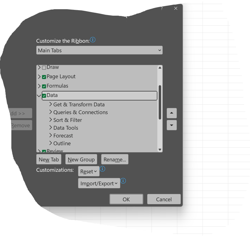 Under Choose a command, select Main Tabs. Click the Plus (+) icon next to Data Labels. Add the data type to the ribbon.