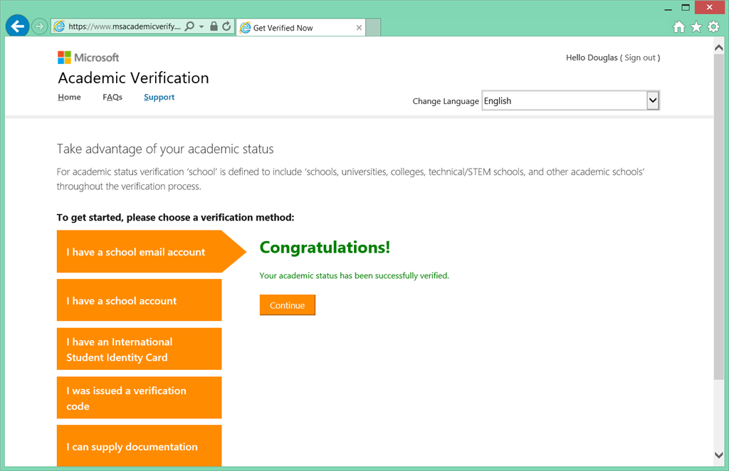 When I am brought here it (as you can see) says that I am already verified. When clicking continue I am brought back to Dreamspark but to this page: