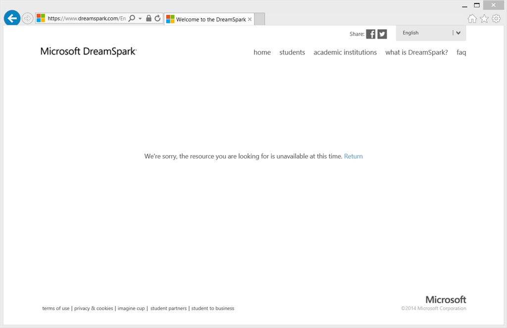 I am simply greeted with the message that the service is unavailable at this time and the "Return" link takes me directly back to Dreamspark where it gives me the verification prompt as shown in the first image.