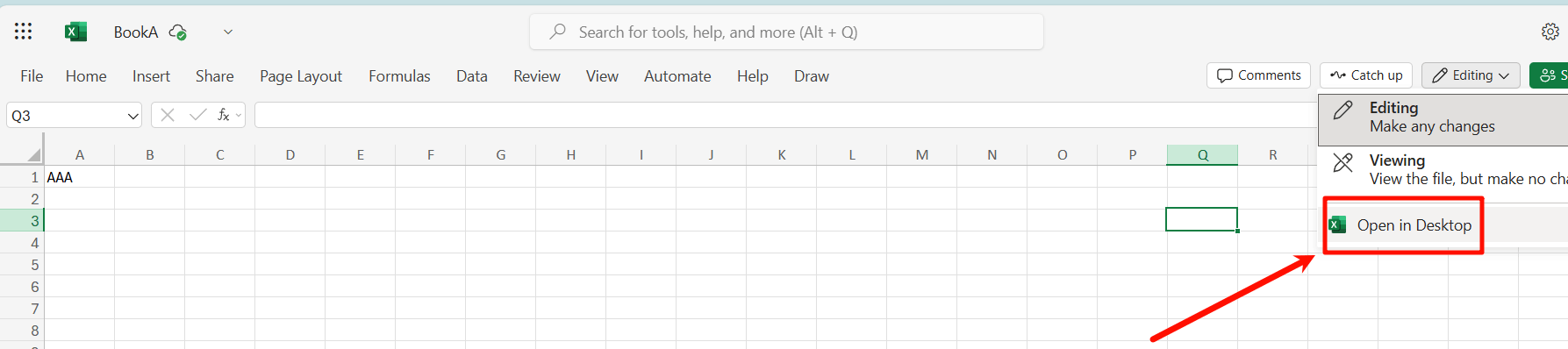**3. Open the file in different way:**Please open the file from web browser first and then click "Editing" > "Open in dekstop app" to open it. This way, you can completely bypass OneDrive and build connection from Excel App to the Cloud directly. Please check if there is any problem in this way.